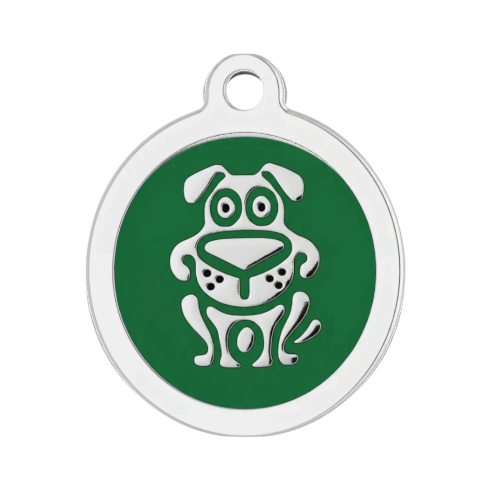 This round, long-lasting dog ID tag features a vibrant green front with a playful puppy print design coated with epoxy for extra protection, and a silver back engraved with your chosen details. Durable materials and high-quality construction ensure it withstands even the most active pet adventures.