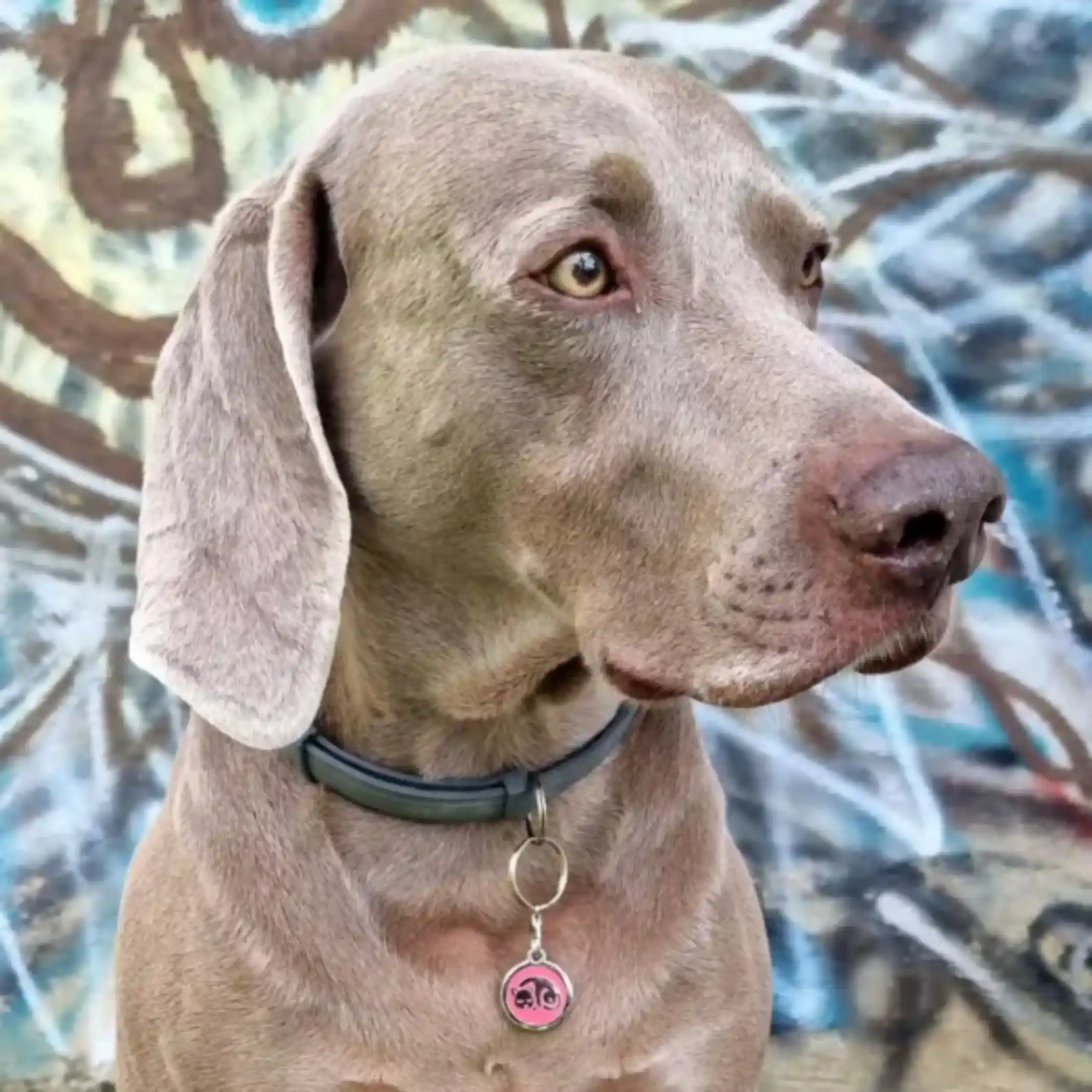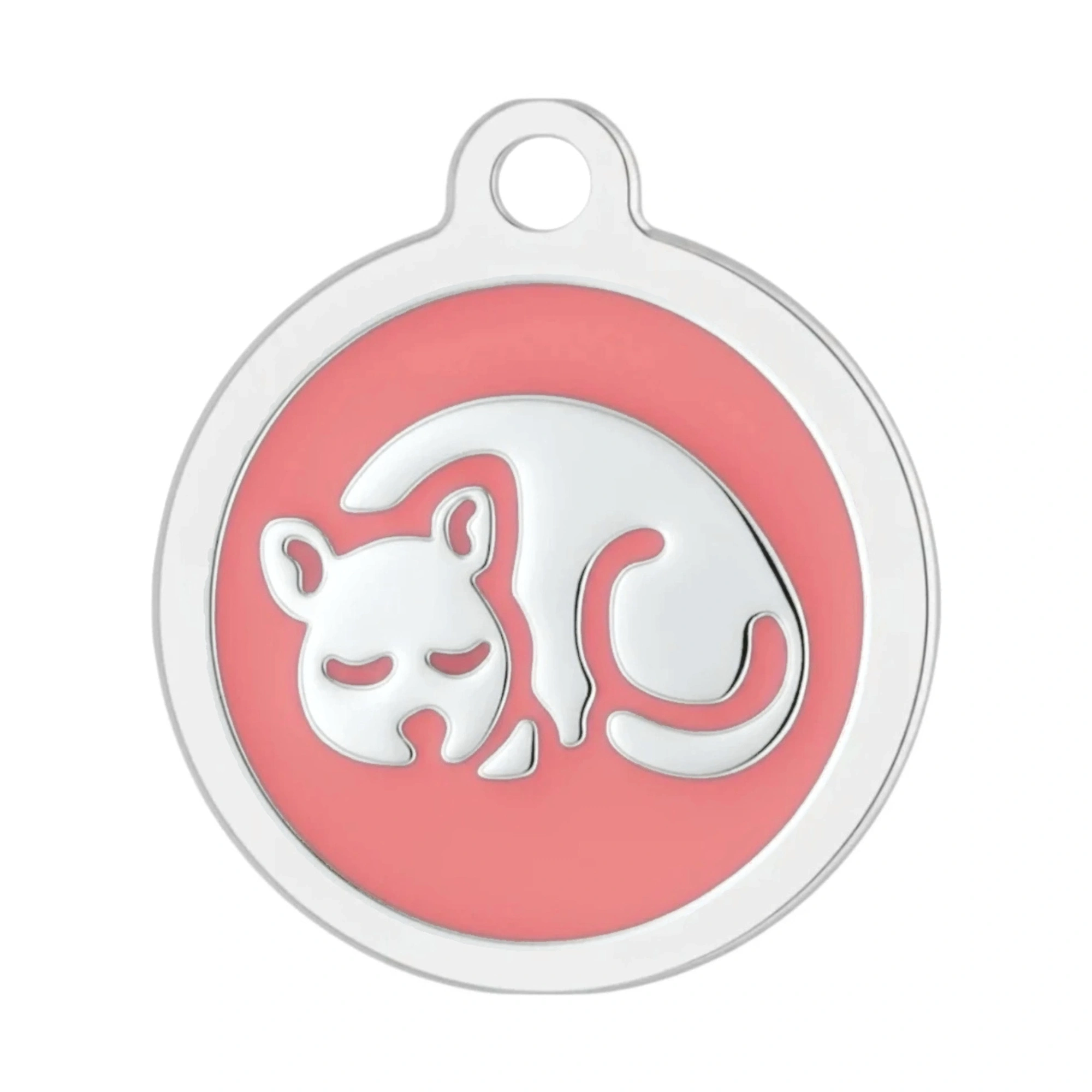 This round, long-lasting cat ID tag features a vibrant pink front with a playful cat print design coated with epoxy for extra protection, and a silver back engraved with your chosen details. Durable materials and high-quality construction ensure it withstands even the most active pet adventures.