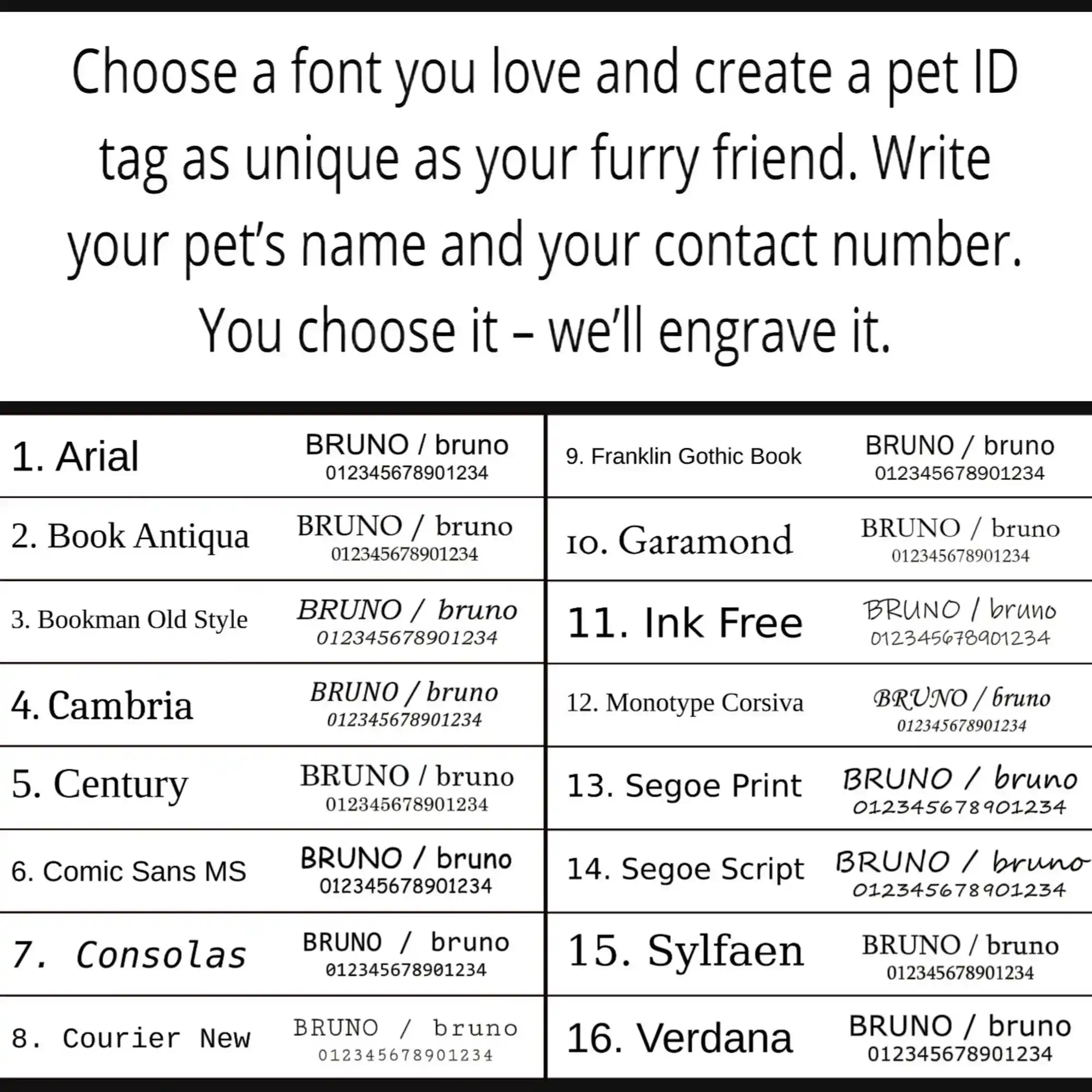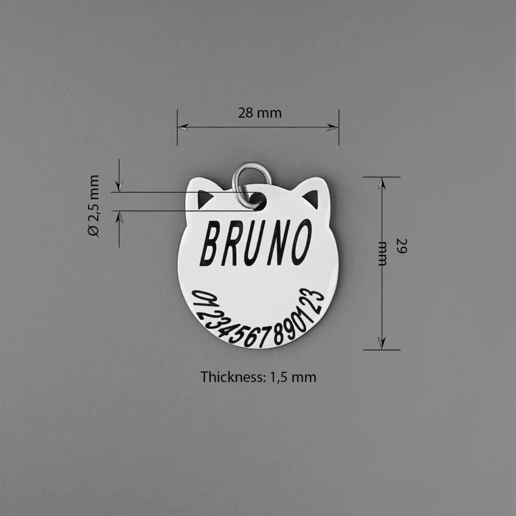 Designed for cats of all sizes, it allows free personalization of up to 60 characters, making your furry friend’s accessory truly unique.Crafted from solid 304 stainless steel with a thickness of 1.5 mm, this cat ID tag is mirror polished on both sides. The durable material ensures long-lasting use, even through the most active pet adventures.Choose a font and add your cat’s name, phone number, or address for easy identification. You choose it — we’ll engrave it for you on one or both sides.